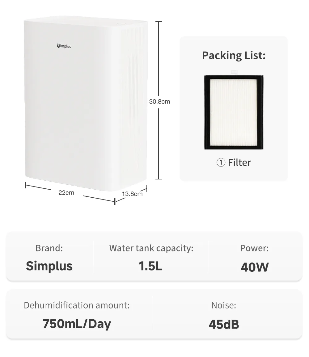 Specifications of Simplus Dehumidifier Air Purifier for Room/Office Air Freshener Efficient and Fast Dehumidification Portable Multifunctional Scene