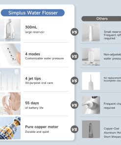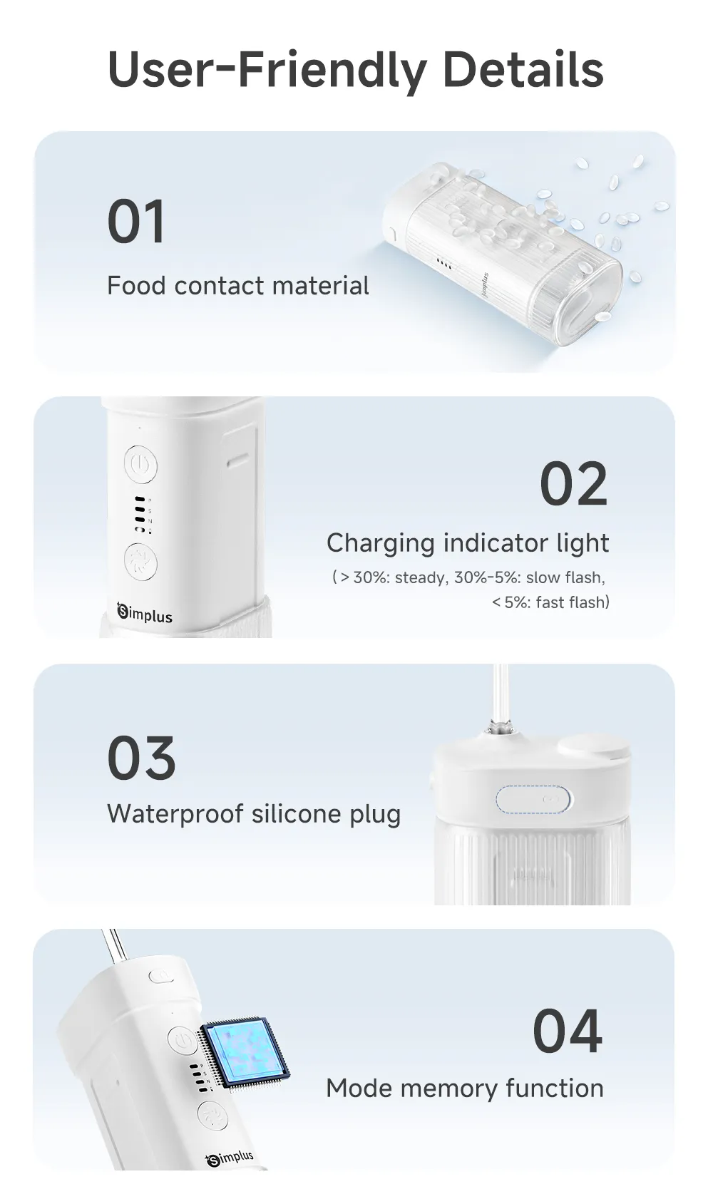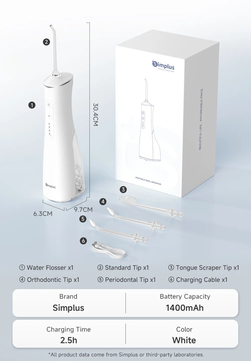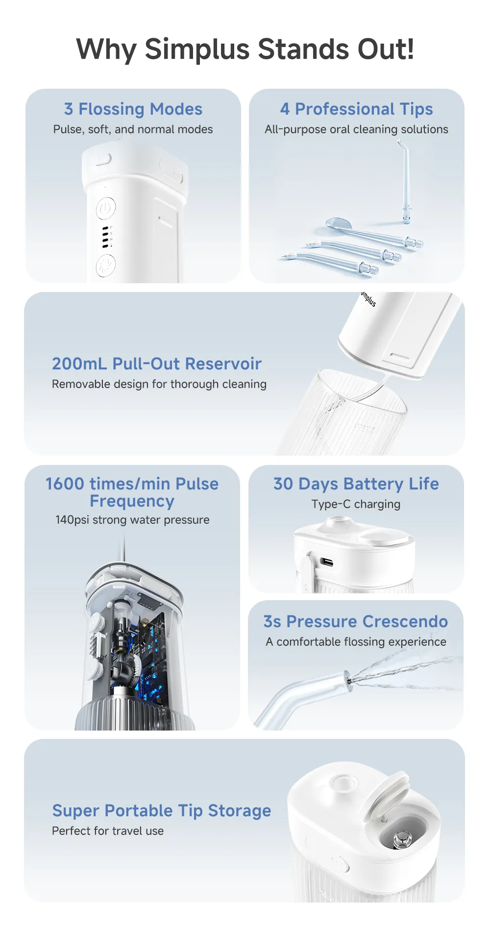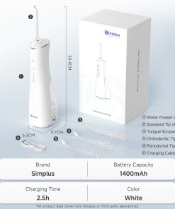 Specifications of Simplus Oral Irrigator Water Flosser Cordless Dental Irrigator Teeth Cleaner Travel Portable 3 Modes 4 Nozzle Tips 200mL Removable Pull-Out Reservoir