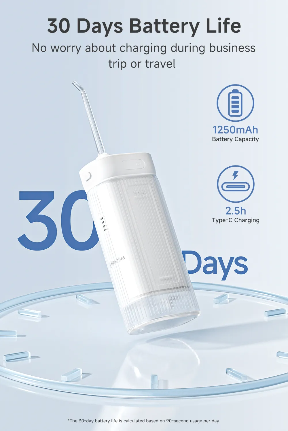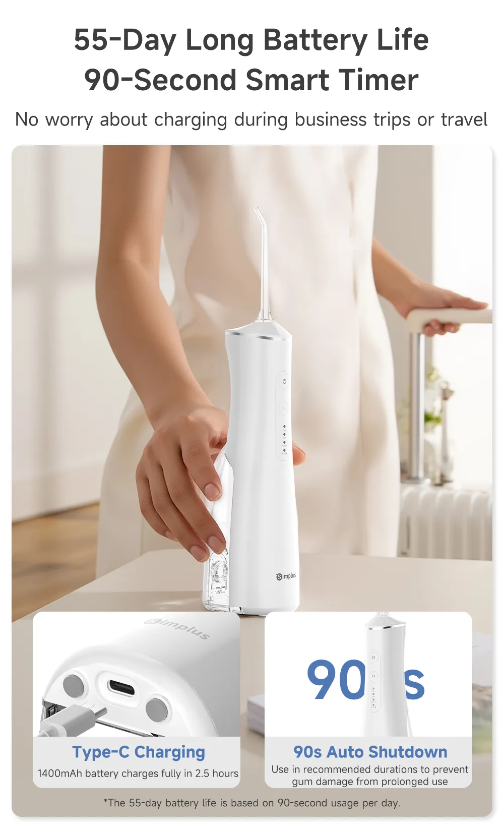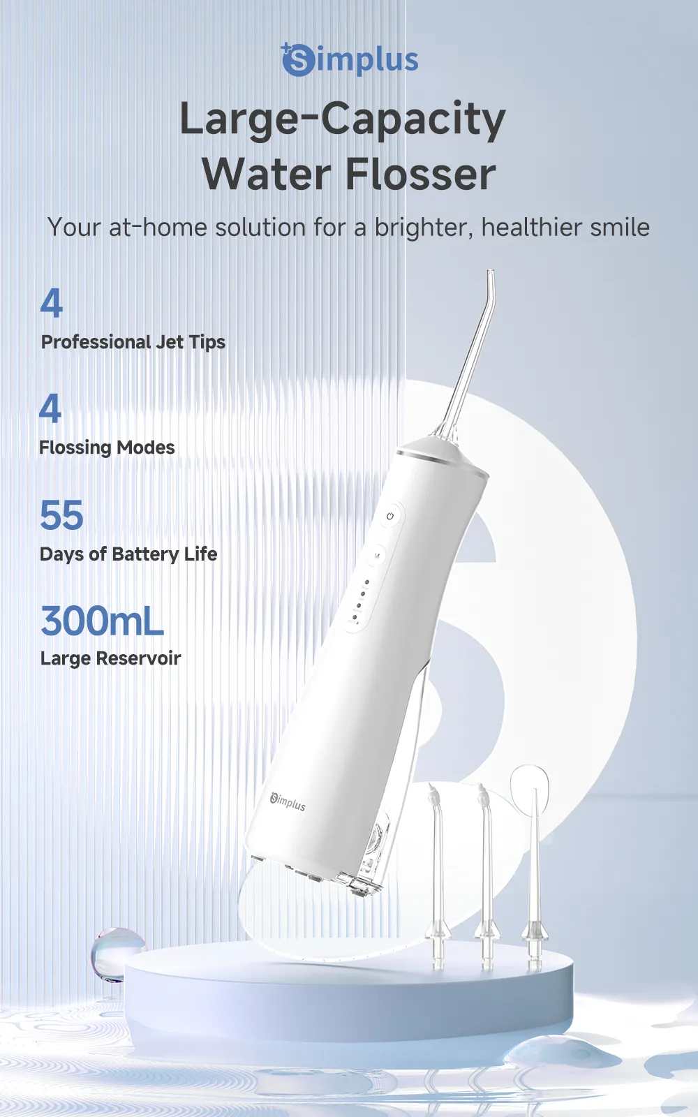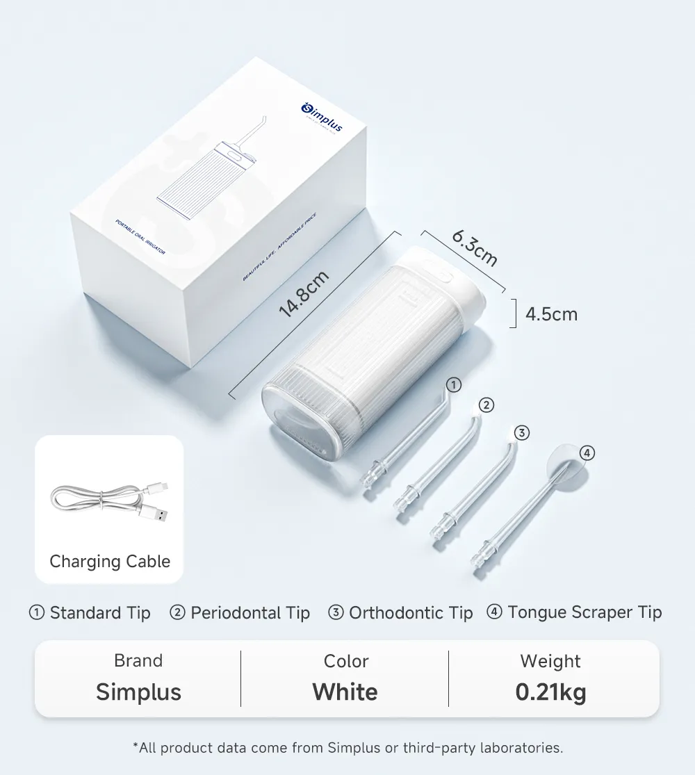 Specifications of Simplus Oral Irrigator Water Flosser Cordless Dental Irrigator Teeth Cleaner Travel Portable 3 Modes 4 Nozzle Tips 200mL Removable Pull-Out Reservoir
