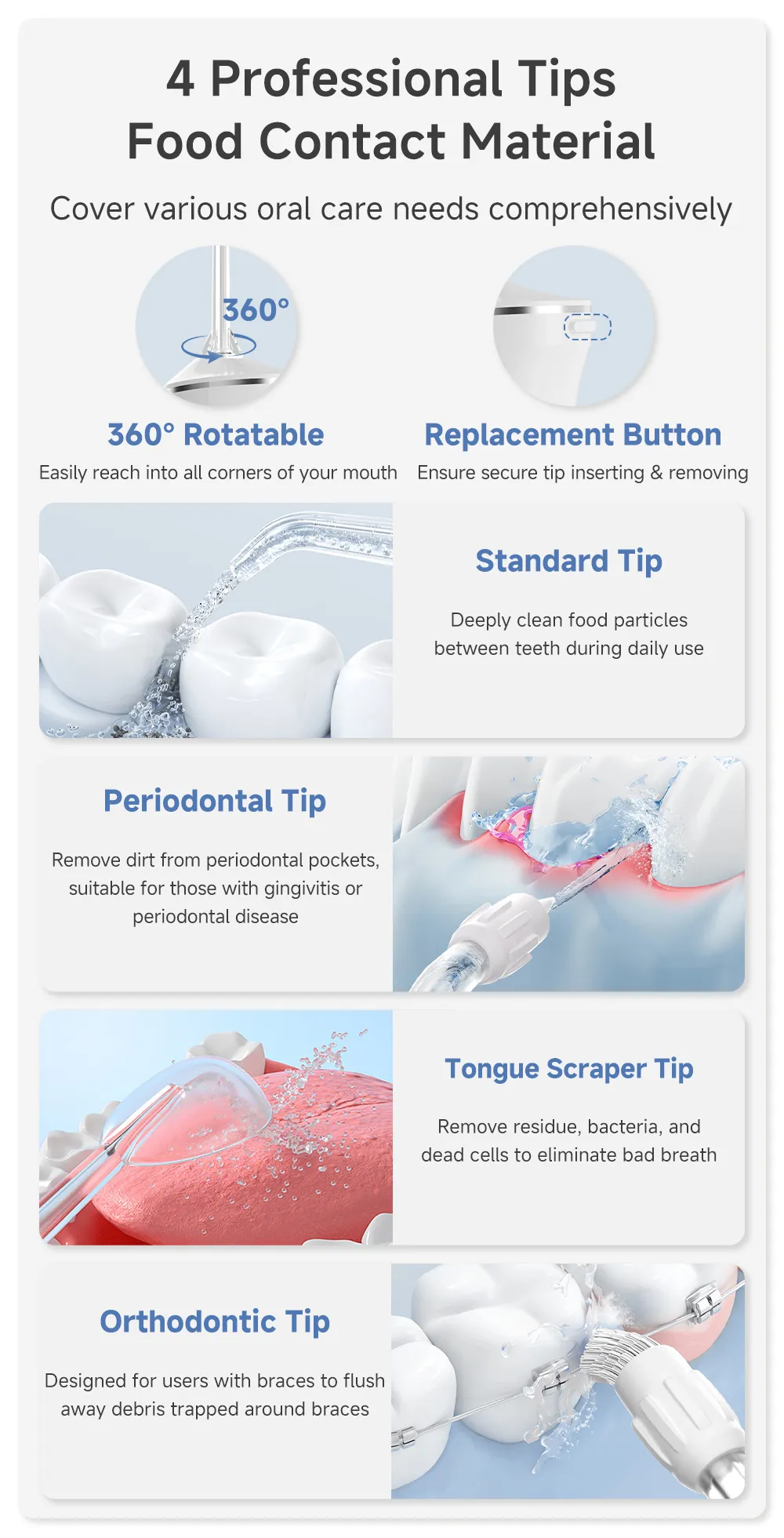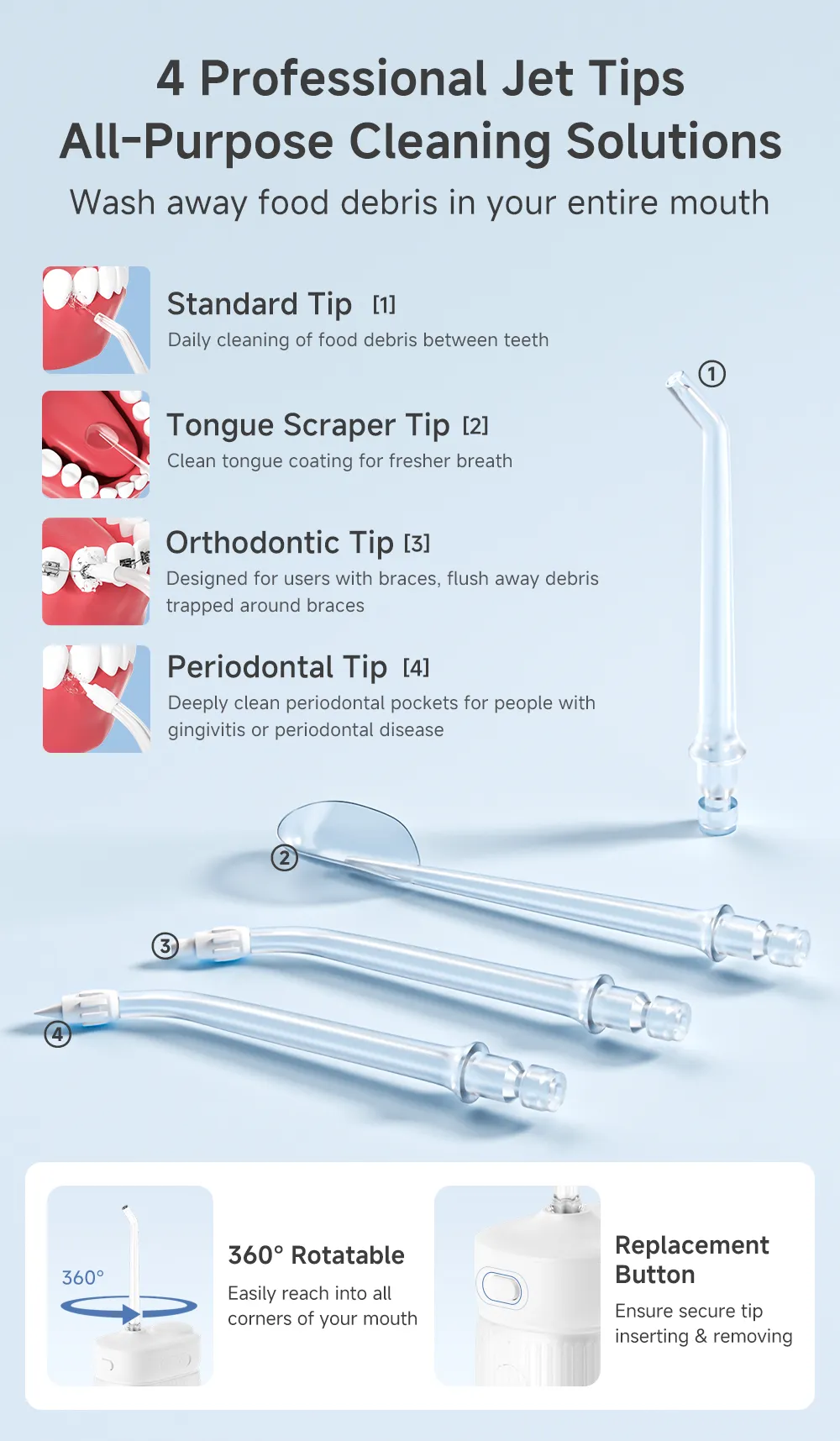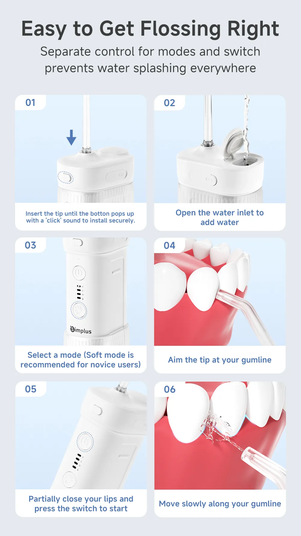 1. For novice users, it is recommended to use the Soft mode with the periodontal pocket tip for the first week of use. After adapting gradually, you can switch to other modes and nozzle tips.