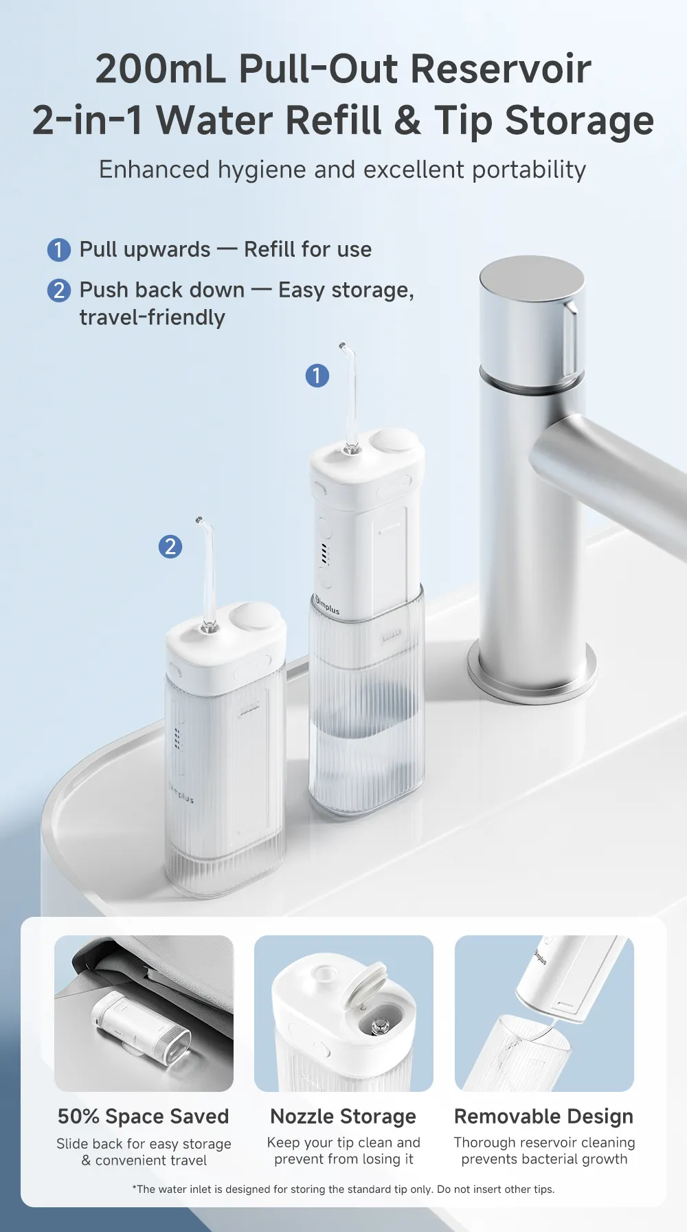 2. To prevent bacterial growth, ensure that no residual water remians in the product. If not in use for an extended period, please remove the reservoir to clean and dry completely for storage.